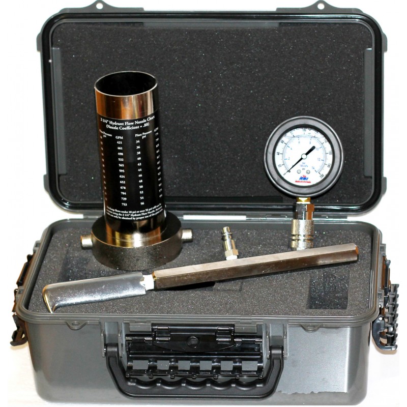 *Este Kit con Boquilla de Flujo de Conexión Rápida con Hoja Estándar , un calibre con cubierta de Goma para protección y una boquilla de Flujo de Hidrante que endereza el chorro para una Lectura mas Precisa del Tubo Pitot Todo en una medida de 12″ X 7″ (estuche Impermeable)